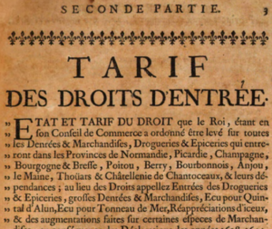 Dès cette époque, le tarif national, qui fait l’objet d’un édit du roi, a vocation à s’appliquer uniformément à toute marchandise entrant ou sortant du territoire royal. La taxation se fait le plus souvent au volume (liquide ou solide), au poids, à la pièce, au mètre, c’est une taxation dite « spécifique ».