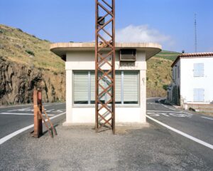 Cerbère est une commune située sur la frontière franco-espagnole. Si son nom dérive de l’expression latine locus cervaria, lieu peuplé de cerfs, il désigne également le chien à trois têtes de la mythologie grecque qui contrôlait l’entrée des enfers et le fleuve Styx. Cerbère possède ainsi une dimension symbolique forte. Au 19e siècle la contrebande avec l’Espagne se développe autour du trafic de tabac. Elle est principalement maritime et incite l’administration douanière à bâtir un poste frontière en 1841, accompagné d’une imposante caserne encore visible de nos jours. L’arrivée du rail en 1878, à l’occasion de la construction de la ligne ferroviaire avec l’Espagne, participe au développement de la ville, qui atteint ainsi 800 âmes, alors que seule une dizaine de familles y résidaient au début du siècle. Cette aubette d’architecture contemporaine obéit aux mêmes contraintes structurelles et fonctionnelles que celle de Dancharia. De petite taille, située au centre des deux axes de circulation, elle laisse une grande visibilité aux douaniers grâce à une large baie vitrée. Sur la route, les lignes blanches au sol précédées de l’inscription « STOP » matérialisent le lieu du contrôle.