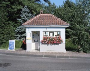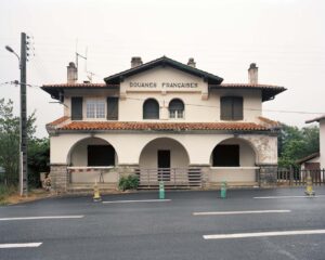 Cet édifice douanier de dimensions réduites se trouve sur la frontière franco-allemande. L’allure de cet ancien poste frappe par sa petitesse, avec ce soubassement couleur taupe, aux murs d’un bleu pastel, aux tuiles orangées et à la fenêtre fleurie. Cette aubette, bien que répondant a priori aux caractéristiques d’un d’un poste frontière classique, surprend par les finitions apportées depuis sa reconversion en point d’information touristique. On retrouve sur ce cliché les caractéristiques empruntées par Nicolas Fussler à l’école de Düsseldorf : stricte frontalité, cadrage serré, aucune présence humaine… La photographie se veut totalement objective dans le but de devenir le support d’un message documentaire plus large, s’insérant dans une série.